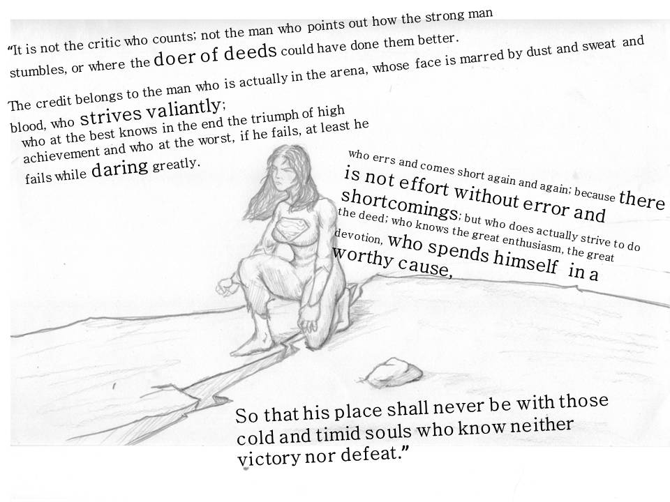 “It is not the critic who counts; not the man who points out how the strong man stumbles, or where the doer of deeds could have done them better. The credit belongs to the man who is actually in the arena, whose face is marred by dust and sweat and blood; who strives valiantly; who errs, who comes short again and again, because there is no effort without error and shortcoming; but who does actually strive to do the deeds; who knows great enthusiasms, the great devotions; who spends himself in a worthy cause; who at the best knows in the end the triumph of high achievement, and who at the worst, if he fails, at least fails while daring greatly, so that his place shall never be with those cold and timid souls who neither know victory nor defeat.”